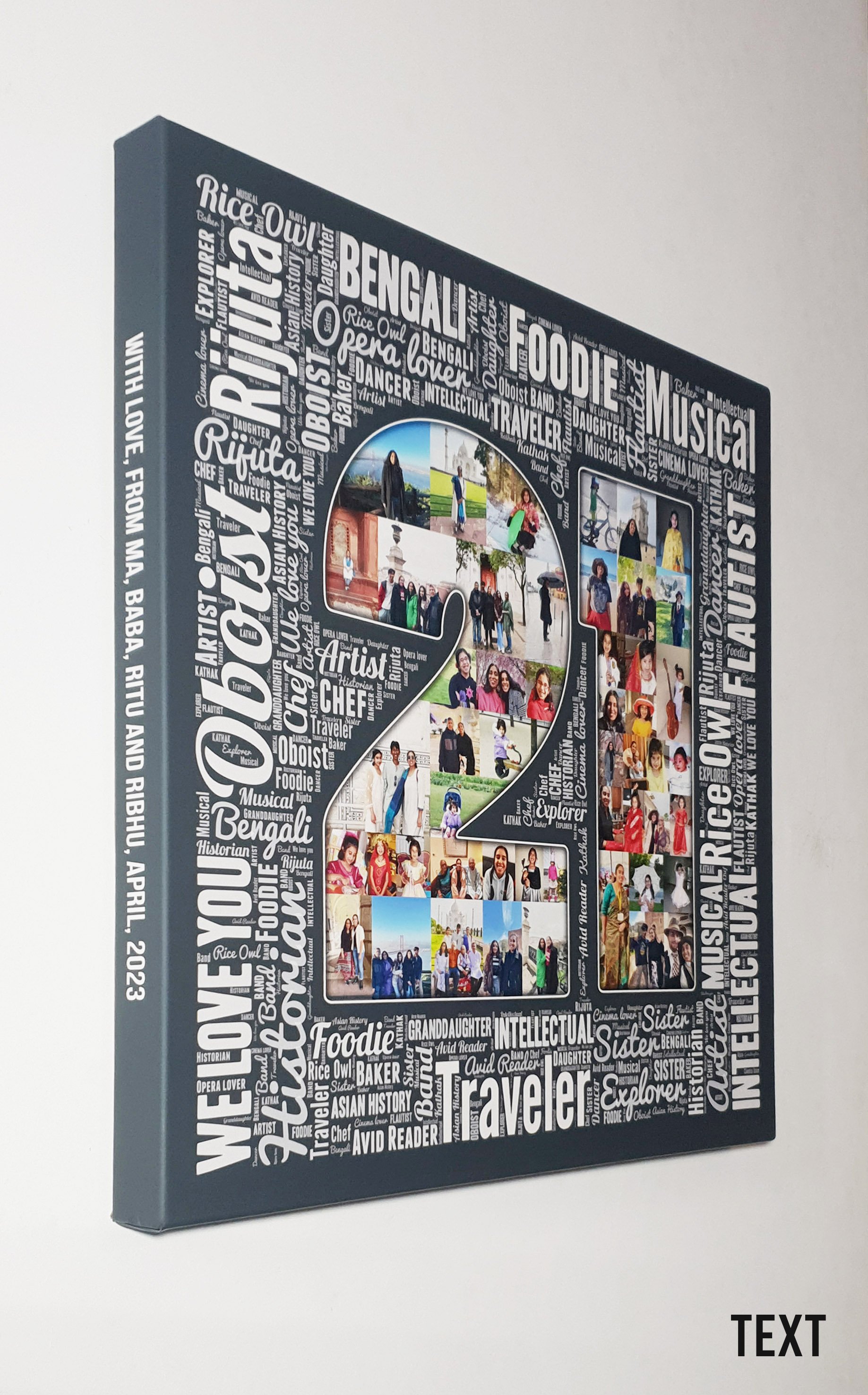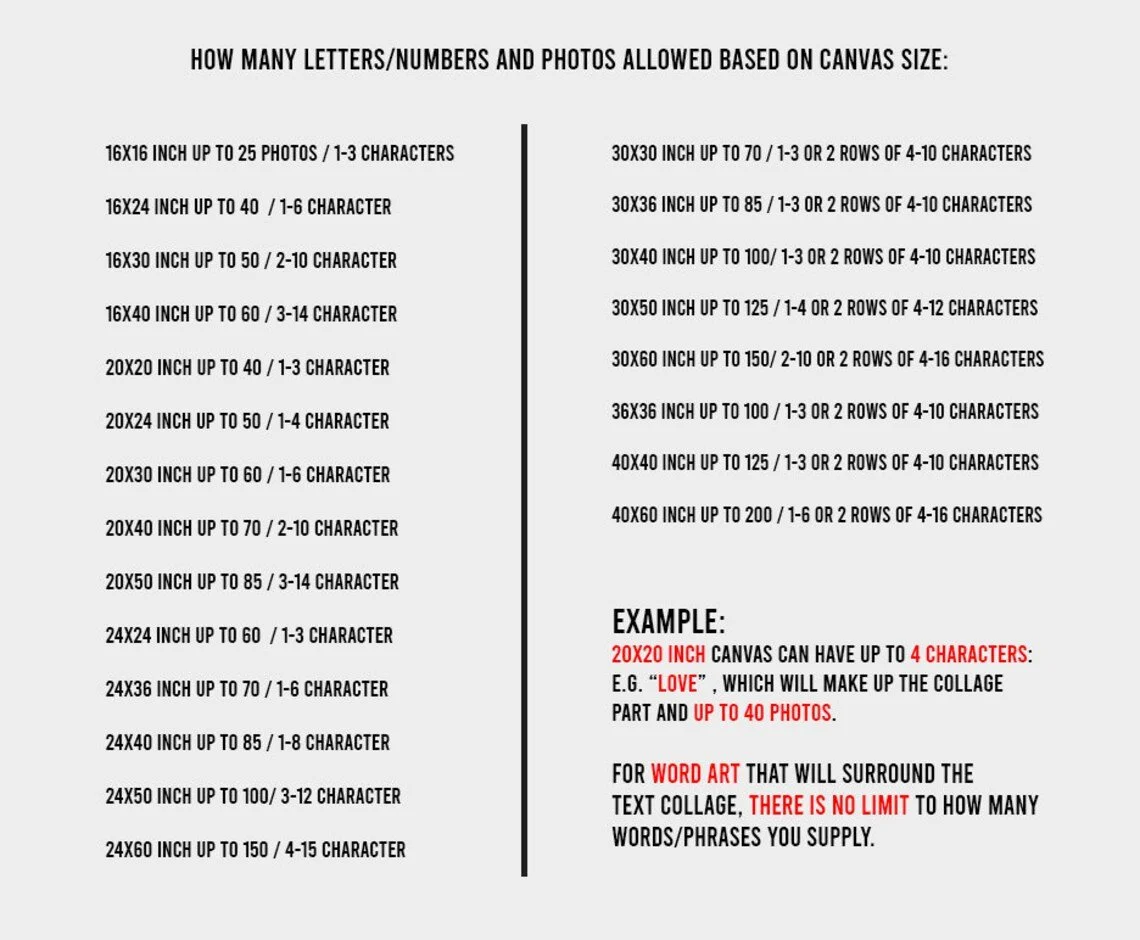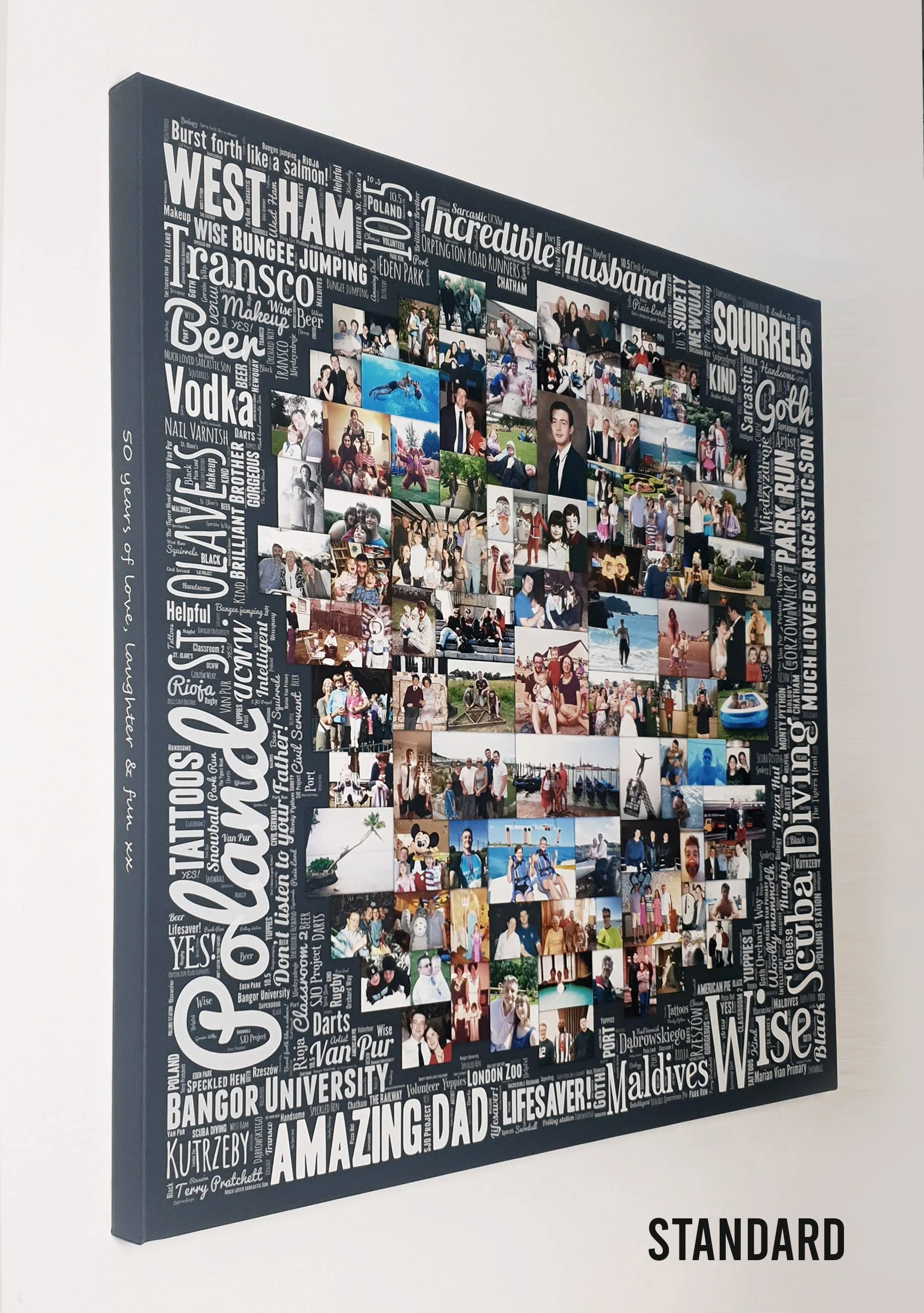 Choose your ideal photo collage product below: Word Art Collage Photo Collage Canvas Print Heart Shaped Photo Collage Word HEART Photo Collage Text Photo Collage Word Art Text Collage - Personalised Gift Word Art Collage - Personalised Gift Map Country Shape Photo Collage Three Panel Split Photo Collage