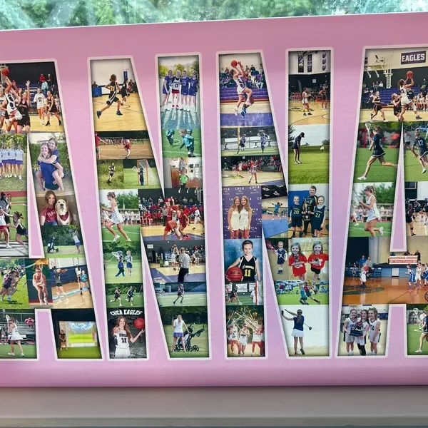 Photo collage on large sign spelling 'WELCOME' with individual pictures of children and family moments inside the letters. View fullsize